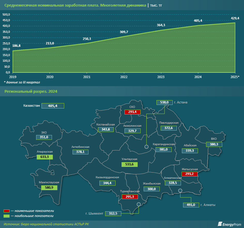 В региональном разрезе всё более явным становится разрыв в зарплатах между жителями главных сырьевых регионов или мегаполисов и всеми остальными. По итогам прошлого года наибольшими средними номинальными заработными платами отличались нефтяные Атырауская (633,3 тыс. тг) и Мангистауская (580,9 тыс. тг) области, а также рудная Улытауская область (533,6 тыс. тг). Важно отметить: такую высокую зарплату в этих регионах получают далеко не все наёмные работники — чаще всего только те, кто работает именно в горнодобывающей промышленности. К числу регионов с наименьшими средними номинальными заработными платами по итогам 2024 года можно отнести Северо-Казахстанскую, Жетысускую (чуть более 293 тыс. тг) и Туркестанскую (295,3 тыс. тг) области.