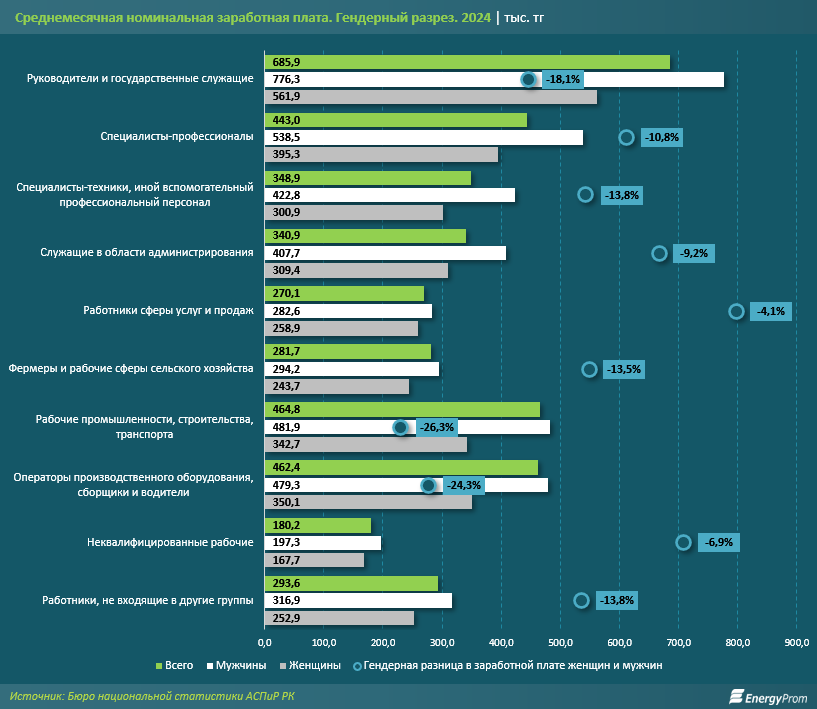 Второе место по размеру средней номинальной зарплаты делят между собой работники промышленности, транспорта, строительства, а также операторы оборудования, сборщики и водители. Те, кто трудится на предприятиях этих отраслей, в прошлом году получали более 460 тыс. тг. Больше среднего — 443 тыс. тг — зарабатывали специалисты-профессионалы. Наименьшую среднюю номинальную зарплату ожидаемо получали представители неквалифицированной рабочей силы: 180,2 тыс. тг.