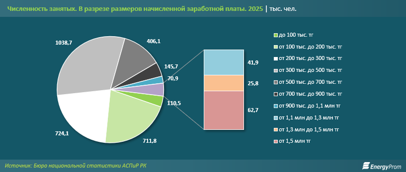 Если распределить всех наёмных работников по уровню зарплаты, то наибольшая численность, по данным БНС, придётся на тех, чья начисленная заработная плата варьируется от 300 тыс. до 400 тыс. тг. В текущем году в Казахстане насчитывается чуть более 1 млн таких граждан, что составило 31,1% от всех занятых. Пятая часть (21,7%) наёмных сотрудников получают от 200 тыс. до 300 тыс. тг, ещё примерно столько же (21,3%) — от 100 тыс. до 200 тыс. тг.
