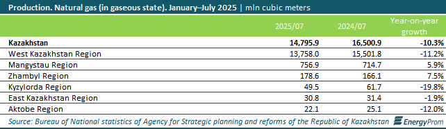 In January–July of this year, natural gas production in Kazakhstan amounted to 14.8 billion cubic meters, down 10.3% compared with the same period in 2024.