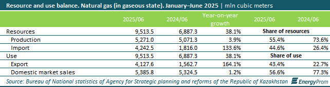 Imports accounted for 44.6% of available resources, while exports made up 43.4%, compared with 22.7% a year earlier. Overall, exports and re-exports surged 2.6 times to 4.1 billion cubic meters. In detail, Kazakhstan supplied natural gas to only two countries: Russia (2.7 billion cubic meters worth 59.4 million US dollars) and China (1.4 billion cubic meters worth 350.4 million US dollars).