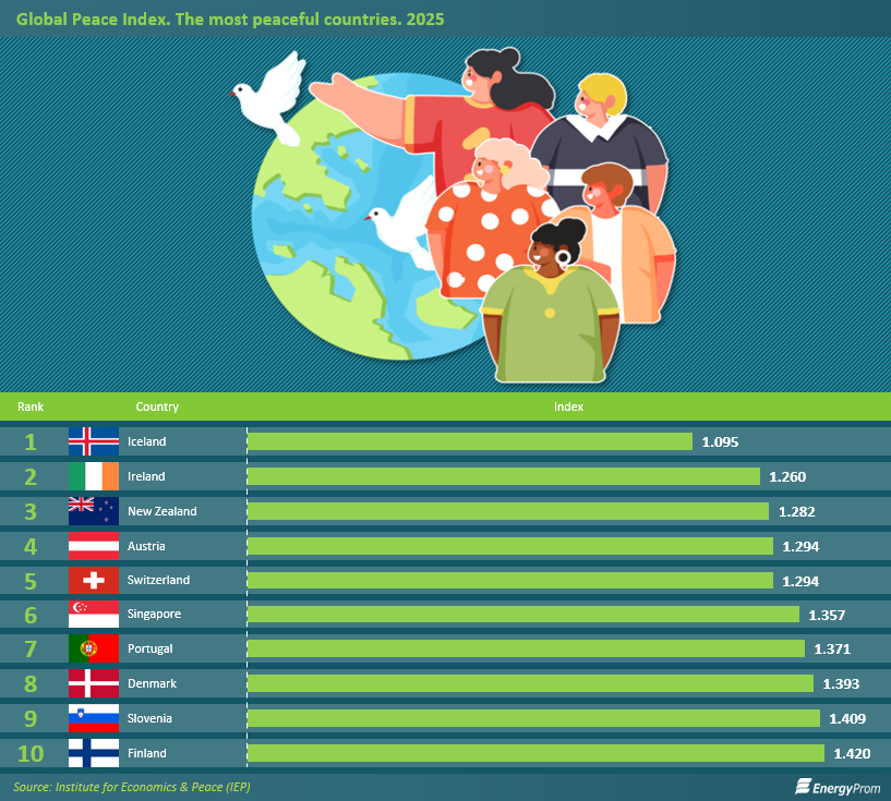 According to the annual Global Peace Index (GPI) published by the Institute for Economics & Peace, Iceland has remained the world’s most peaceful country for 17 consecutive years, leading the ranking in 2025 with an index score of 1.095. The lower the score, the more peaceful the country. Other countries among the most peaceful include Ireland (1.26), New Zealand (1.282), Austria (1.294), Switzerland (1.294), Singapore (1.357), Portugal (1.371), Denmark (1.393), Slovenia (1.409), and Finland (1.42).