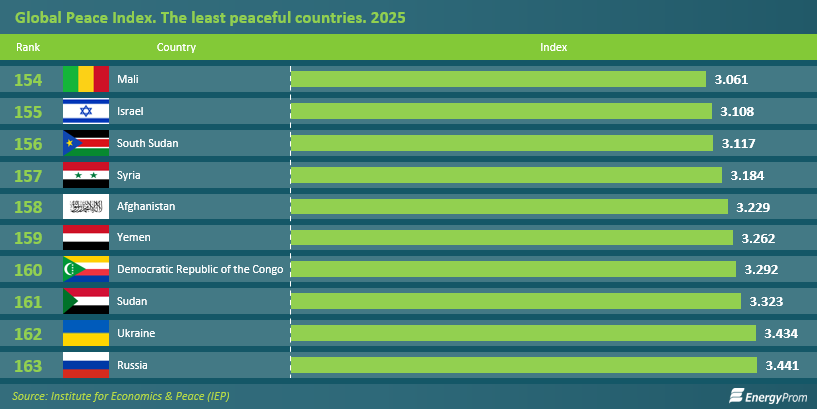According to the Global Peace Index 2025, the least peaceful countries were Russia (3.441) and Ukraine (3.434), which have been engaged in an armed conflict for nearly four years. Other countries among the least peaceful included Sudan (3.323), the Democratic Republic of the Congo (3.292), Yemen (3.262), Afghanistan (3.229), Syria (3.184), South Sudan (3.117), Israel (3.108), and Mali (3.061).