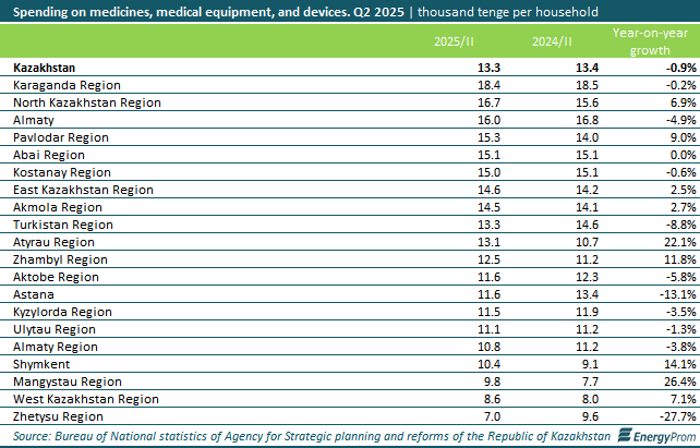 By region, the highest spending on medicines, equipment, and devices was recorded in Karaganda Region: 18.4 thousand tenge per household, 0.2% less than a year earlier. North Kazakhstan Region (16.7 thousand tenge) and Almaty (16 thousand tenge) ranked second and third. The lowest spending in this segment was observed in Zhetysu Region (7 thousand tenge), West Kazakhstan Region (8.6 thousand tenge), and Mangystau Region (9.8 thousand tenge).