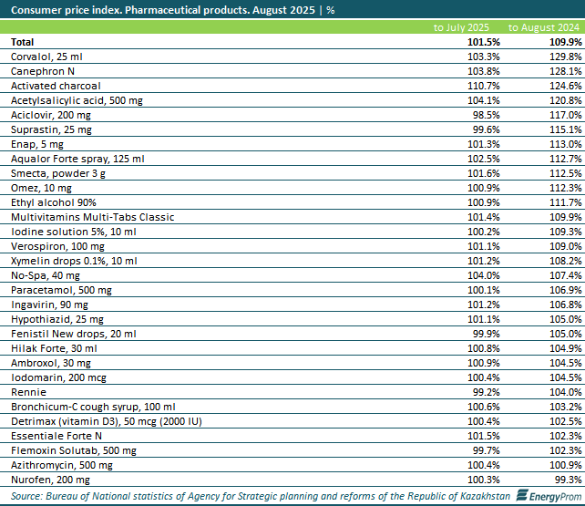 Among the medicines regularly monitored by the Bureau of National statistics of Agency for Strategic planning and reforms of the Republic of Kazakhstan, the sharpest monthly increases were recorded for activated charcoal (up 10.7%), acetylsalicylic acid (up 4.1%), No-Spa (up 4%), Canephron N (up 3.8%), Corvalol (up 3.3%), Aqualor Forte (up 2.5%), and Smecta (up 1.6%). Not all drugs rose in price, however: Fenistil New dropped by 0.1%, Flemoxin Solutab by 0.3%, Suprastin by 0.4%, Rennie by 0.8%, and Aciclovir by 1.5%.