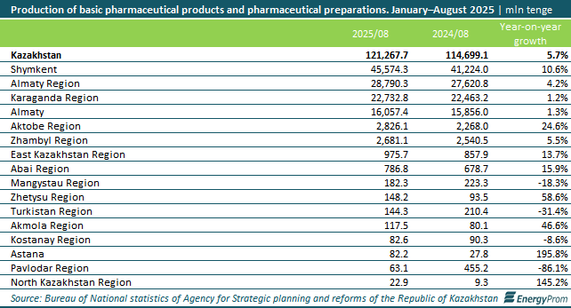 As for sector output, in January–August of this year, the production of basic pharmaceutical products and pharmaceutical preparations in Kazakhstan amounted to 121.3 billion tenge, up 5.7% in value terms compared to the previous year. Within this, the output of pharmaceutical preparations and medical supplies rose by 6% to 116.9 billion tenge, while the production of basic pharmaceutical products declined slightly by 0.1% to 4.4 billion tenge.