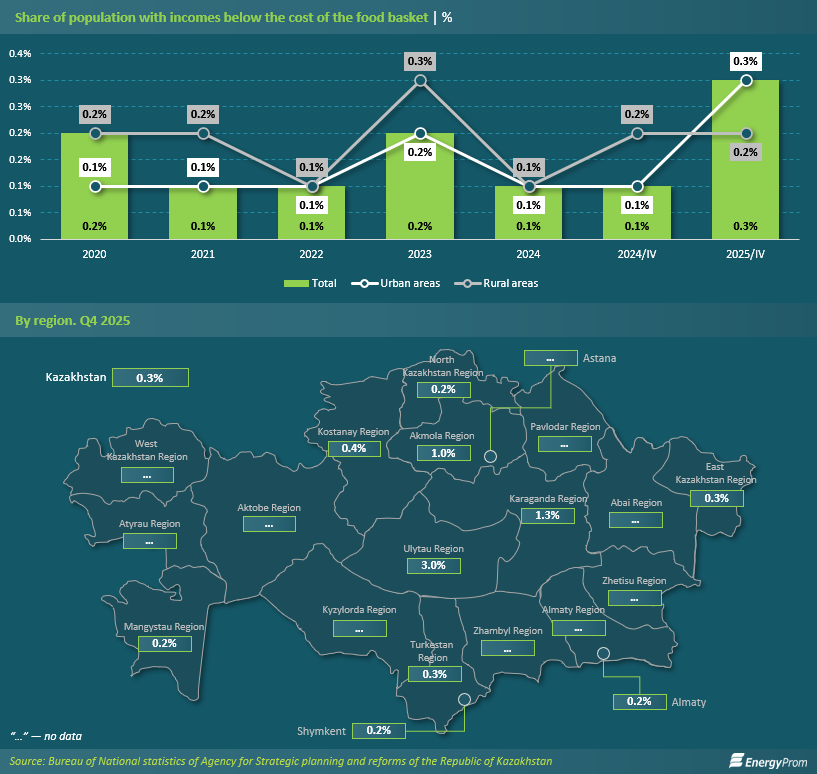 Particular concern is driven by the sharp increase in the share of the population with incomes below the cost of the food basket — an indicator of extreme poverty. In the fourth quarter of 2025, the proportion of those whose incomes barely cover basic food needs rose to 0.3%, tripling compared to the same period of the previous year. Notably, the increase was primarily observed in urban areas, where the share of the extremely poor grew from 0.1% to 0.3%, while in rural areas it remained unchanged at 0.2%.