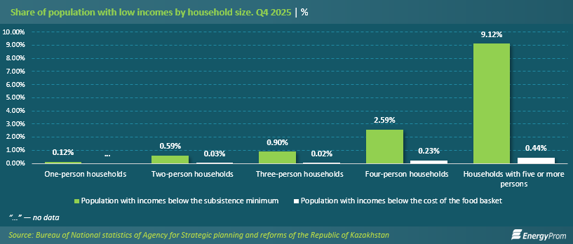 Large families remain the most vulnerable group. The risk of falling below the poverty line is directly correlated with household size. Among households with five or more members, the share of the population with incomes below the subsistence minimum reached 9.1%. This is 3.5 times higher than among four-person households (2.6%) and ten times higher than among three-person households (0.9%). Extreme poverty is also most prevalent in large families: 0.4% of their members have incomes below the cost of the food basket, while in smaller households this indicator is close to zero. For single-person households, data on incomes below the food basket threshold are not available.