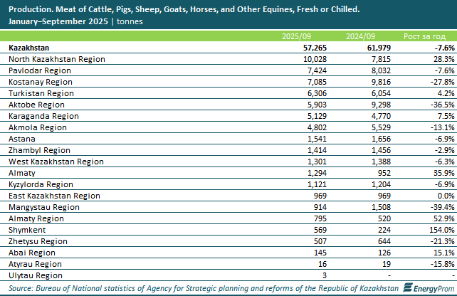 In January–September of the current year, Kazakhstan produced 57.3 thousand tonnes of fresh or chilled meat from cattle, pigs, sheep, goats, horses, and other equines — 7.6% less than in the same period of 2024.