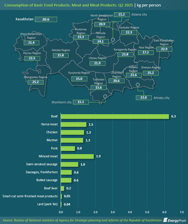 The lowest consumption of meat and meat products in the second quarter of 2025 was observed in the Kyzylorda Region — 15 kilograms per person, compared to 16.2 kilograms a year earlier. Similarly modest figures were recorded in Shymkent and the Turkistan Region — 15.1 and 15.6 kilograms, respectively.