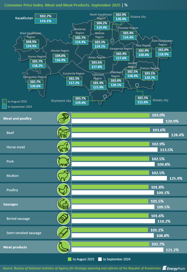 Regionally, in September, monthly price increases for meat and meat products were recorded across all regions of Kazakhstan. The sharpest monthly rise was observed in the West Kazakhstan (4.9%), North Kazakhstan (4.2%), and Aktobe (4.0%) Regions, while the smallest was in the Turkistan Region (1.4%).