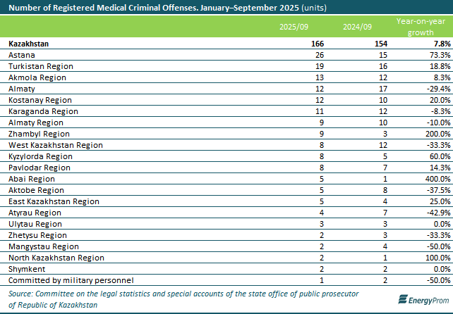 Regionally, the highest number of medical criminal offenses in January–September 2025 was recorded in Astana — 26 cases, compared to 15 a year earlier. The Turkistan (19 cases) and Akmola (13 cases) Regions followed. The lowest number of such offenses was reported in Shymkent, as well as in the North Kazakhstan, Mangystau, and Zhetysu Regions — two cases each.