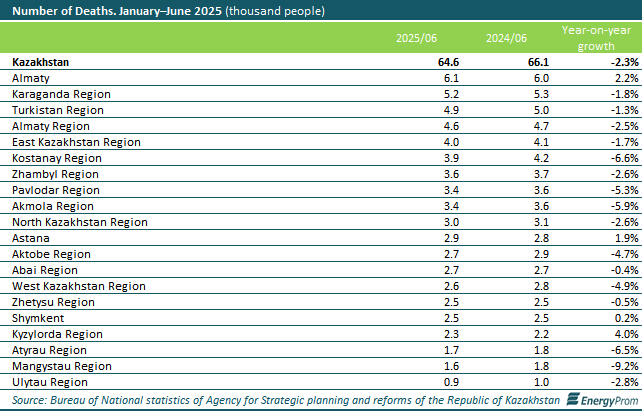 Regionally, the highest number of deaths in the first half of 2025 was recorded in Almaty — 6.1 thousand people, compared to 6 thousand a year earlier. It was followed by the Karaganda Region (5.2 thousand), Turkistan Region (4.9 thousand), Almaty Region (4.6 thousand), and East Kazakhstan Region (4 thousand). The lowest mortality figures were recorded in the Ulytau Region (933 people), Mangystau Region (1.6 thousand), and Atyrau Region (1.7 thousand).
