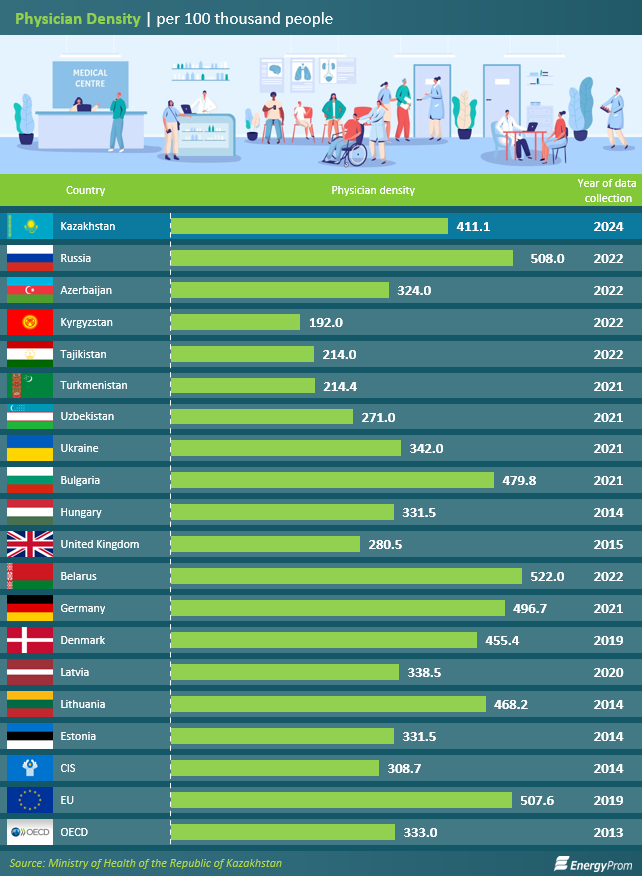 Interesting data: as of 2024, Kazakhstan had 411.1 physicians per 100,000 people. For comparison, the average figure across CIS countries was 308.7, in OECD member states — only 333, and in the European Union — 507.6 per 100 thousand people.