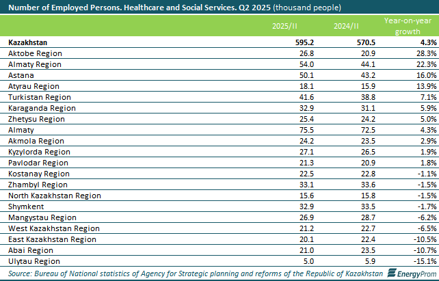 Notably, although the total number of employees in the sector across the country increased, nearly half of the regions — 9 out of 20 — recorded a decline. The most significant decreases in employment in healthcare and social services were observed in the Ulytau Region (down by 15.1%), Abai Region (down by 10.7% to 21 thousand people), and East Kazakhstan Region (down by 10.5% to 20.1 thousand people). The smallest decrease was recorded in the Kostanay Region — down by 1.1% to 22.5 thousand people.