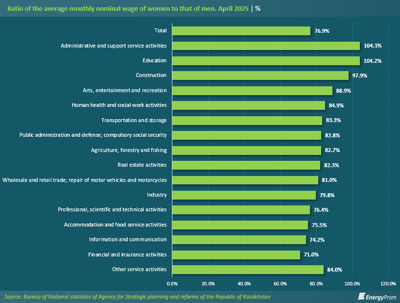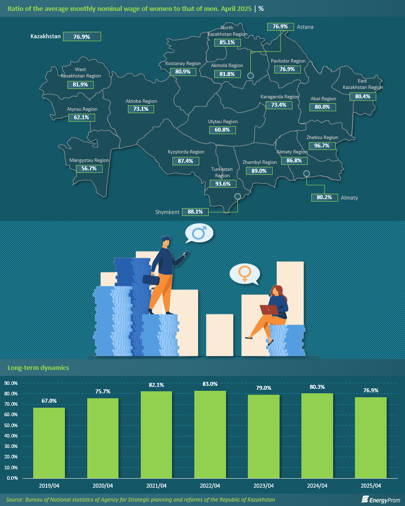 The gender pay gap in Kazakhstan remains persistent and significant, despite periods of partial improvement. As of April last year, the average monthly nominal wage of women amounted to only 76.9% of that of men. This means that, on average, women earn nearly a quarter less than men, despite comparable participation in the economy: 77 tiyn per 1 tenge, respectively.