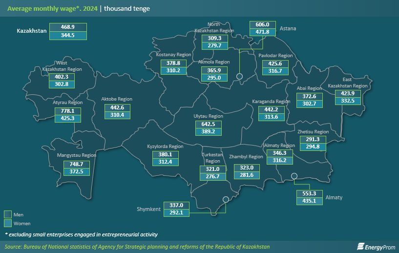 In major cities, the situation varied significantly: in Shymkent, women earned 88.1% of men’s wages, in Almaty — 80.2%, and in Astana — 76.9%.