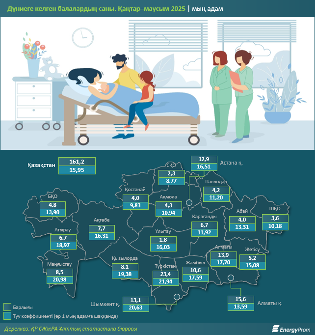 Бүгінде Қазақстан халқының саны 20,4 млн адамнан асты. 2025 жылдың алғашқы жартыжылдығында елімізде 161,2 мың сәби дүниеге келді. Әдеттегідей ең көп туу көрсеткіші Түркістан облысында тіркелді (23,4 мың адам), одан кейінгі орындарда — Алматы (15,6 мың адам), Алматы облысы (13,9 мың адам), Шымкент (13,1 мың адам) және Астана (12,9 мың адам).