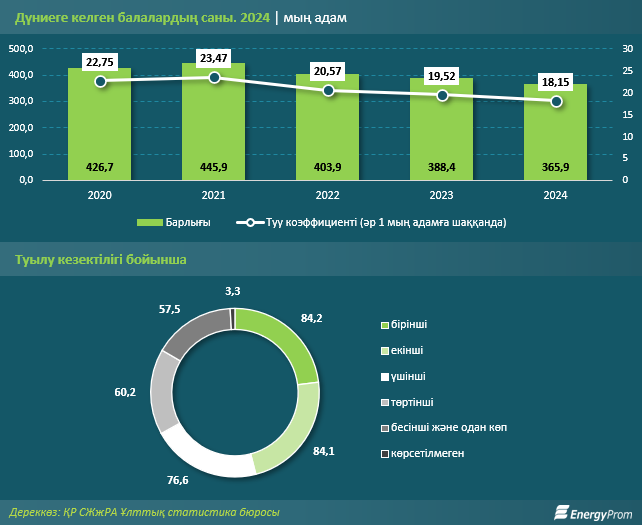 Мәлімет үшін: өткен жылы елімізде 365,9 мың сәби дүниеге келді. Олардың 23%-ы — отбасындағы тұңғыш бала, 23%-ы — екінші, 20,9%-ы — үшінші, 16,4%-ы — төртінші, ал 15,7%-ы — бесінші және одан да көп. Бұл дерек қазақстандықтардың балажан әрі көпбалалы болуды құп көретін халық екенін айқындайды.