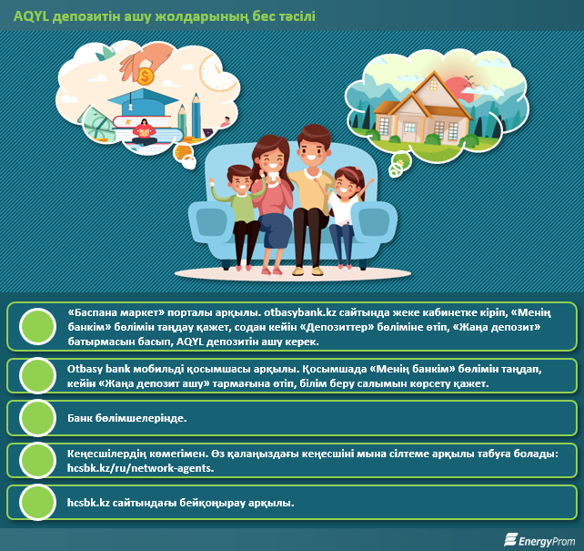 Төмендегі ақпараттық кестеде Отбасы банкінде бала атына AQYL депозитін ашу бойынша нұсқаулық көрсетілген. Бұл қаржы институты мысалға алынған себебі, егер бала білім грантын иеленсе, «Келешек» бағдарламасы аясында жиналған қаражатты тұрғын үй жағдайын жақсартуға жұмсауға болады. Мұндай жағдайда шоттағы барлық қаражат — банк сыйақысы, мемлекеттік сыйлықақы және бастапқы капитал Отбасы банкіндегі тұрғын үй депозитіне аударылып, жеке баспаналы болуға жасалған алғашқы қадамыңыз болады.
