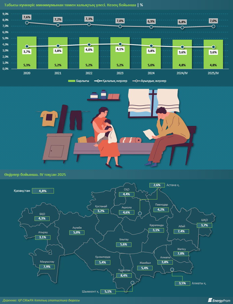 2025 жылдың төртінші тоқсанында Қазақстан халқының 4,8%-ының немесе 172,7 мың отбасындағы 988,2 мың адамның табысы ең төменгі күнкөріс деңгейінен (айына жан басына шаққанда шамамен 58,8 мың теңге) төмен болды. Бір жыл ішінде мұндай азаматтардың саны 2%-ға артты.