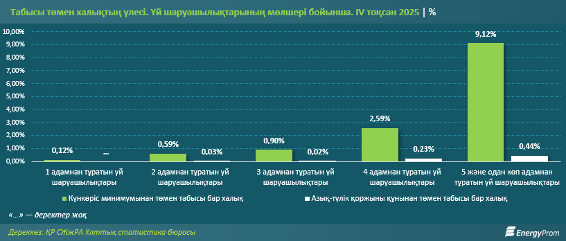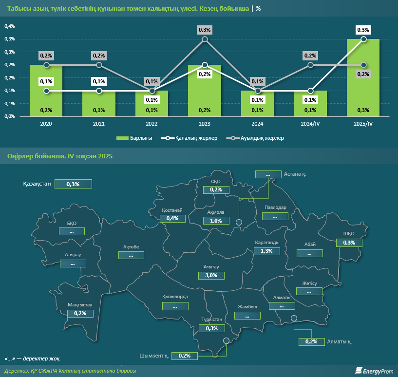 Ерекше алаңдататыны — азық-түлік себетінің құнынан төмен табыс алатын халық үлесінің күрт артуы. Табысы әрең тамаққа жететін халықтың үлесі 2025 жылдың төртінші тоқсанында 0,3%-ға дейін күрт өсіп, өткен жылдың дәл осындай кезеңімен салыстырғанда үш есеге артты. Айта кетерлігі, бұл өсім, ең алдымен, қалаларда тіркелді, кедей халықтың үлесі 0,1%-дан 0,3%-ға дейін көбейді. Ал ауылдық жерлерде мұндай халықтың үлесі өзгеріссіз қалып, 0,2%-ды құрады.