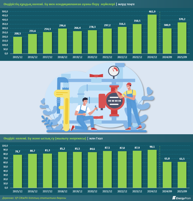 Мәлімет үшін: 2025 жылдың үш тоқсанында жылу энергиясын беру көлемі 61,5 млн Гкал болды, бұл 2024 жылдың дәл осындай кезеңіндегі 61,8 млн Гкал көрсеткішінен сәл төмен. Құндық мәні бойынша жылу энергетикасы саласындағы (бу мен кондицияланған ауаны беру) өндіріс көлемі 370,2 млрд теңгені құрады.