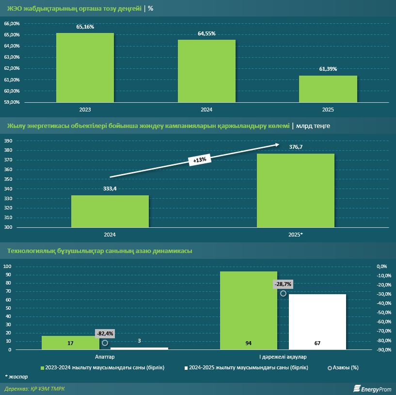 Биыл ЖЭО жабдықтарының орташа тозуы 61,39%-ды құрады, бұл өткен жылғы 64,55%-дан және 2023 жылғы 65,16%-дан төмен. Яғни, жағдай біртіндеп жақсарып келеді. Аймақтарда әртүрлі сатыда жүргізіліп жатқан ауқымды жөндеу жұмыстары өз нәтижесін беруде. Жылыту маусымы басталар алдында 4 энергетикалық блокта, 31 қазандықта және 20 турбинада жөндеу жұмыстары жүргізілді. Оның ішінде 5 энергетикалық блокта, 22 қазандықта және 12 турбинада жөндеу жұмыстары толық аяқталды. Мысалы, Петропавл ЖЭО‑2 жылыту маусымында жаңа түтін құбырын іске қосты, қазандық пен турбиналық жабдыққа күрделі жөндеу жұмыстары жүргізілді.