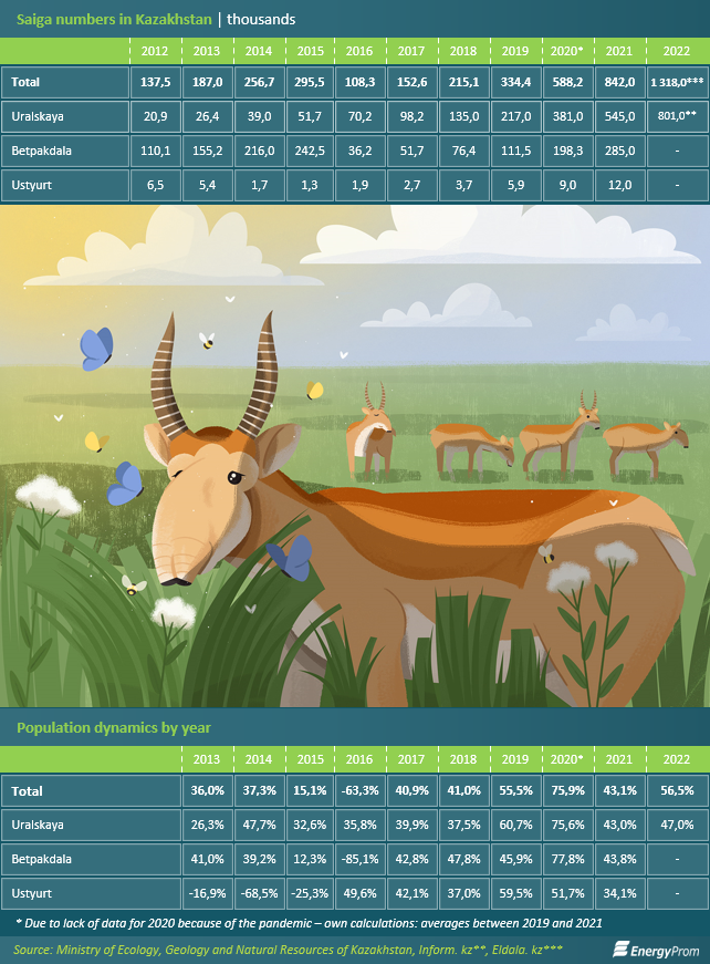 In 2021, there were 842 thousand saigas in the country, while in 2019 – 334.4 thousand, and in 2018 – 215.1 thousand. In 2022, according to the Ministry of Ecology, the number of saigas has already reached 1.3 million. In other words, according to official data, there is a dynamic increase in the stock year by year.