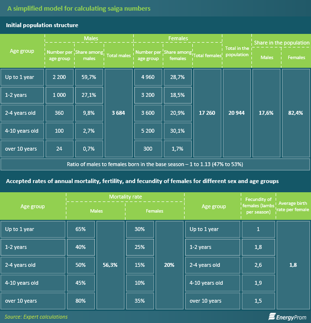 A simplified model was developed, based on data from Soviet period studies and several foreign publications describing different demographic parameters of saiga herd development.