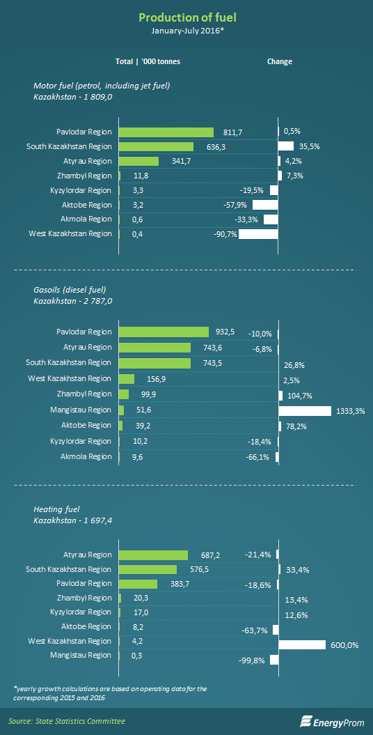 Output of motor fuel reached 1.8m tonnes – up by 10.6% year on year. The Pavlodar refinery is leading in terms of petrol production – almost 45% of Kazakh output or 811,700 tonnes (up by 0.5% year on year). The highest growth was recorded at the Shymkent oil refinery – 35.5% year on year to 646,300 tonnes. The Atyrau refinery produced 341,700 tonnes of motor fuel in the first seven months of 2016.
