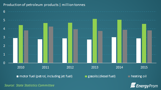 Production of both motor and diesel fuel and heating fuel decreased in 2015. Earlier, in 2014, petrol output grew significantly (10.1% year on year), heating oil production also grew (3.8% year on year), while diesel fuel fell by 2% on 2013).