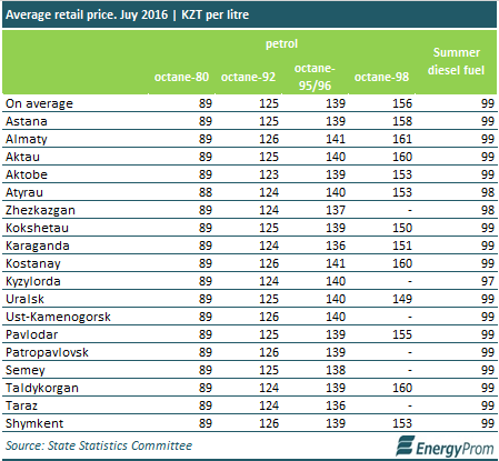 In July the price of octane-80 petrol increased by 2.2% year on year to KZT89 per litre, octane-92 petrol by 16.4% to KZT125 per litre, octane-95/96 petrol by 7.8% to KZT139 per litre and octane-98 petrol by 3.6% to KZT156 per litre.