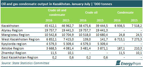 In the first seven months of 2016 Kazakhstan produced 45.41m tonnes of oil and gas condensate, 3.4% down year on year. In particular, oil production stood at 38.48m or 2.3% less year on year, while gas condensate output fell by 7.8% year on year to 6.94m tonnes.