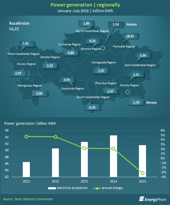 Events: According to a report by the Kazakh operator of the electricity market KOREM, the following regions increased power generation in the first half of 2016 compared to the same period of last year: South Kazakhstan Region – up by 25%, Aktobe Region 19%, North Kazakhstan Region 18%, Akmola Region 13%, East Kazakhstan Region 13%, Almaty Region 9%, Atyrau Region 3% and Mangistau Region 2%.