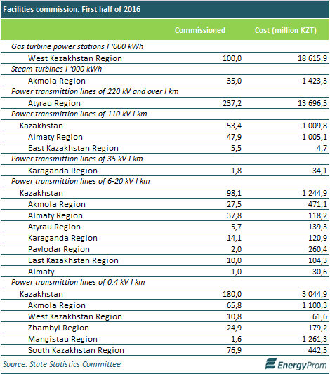 In the first six months of 2016, gas turbine power stations with a capacity of 100,000 kW was commissioned in West Kazakhstan Region. These facilities cost KZT18.6bn.