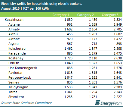 Electricity charges for the population that uses electric cookers averaged KZT1,030 per 100 kWh for Category 1* consumers (up by 3.6% year on year), KZT1,459 for Category 2 consumers (up by 4.2% year on year) and KZT1,949 for Category 3 consumers (up by 4.2% year on year) in Kazakhstan in August.