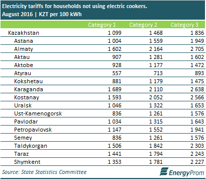 The highest tariffs were recorded again in Kostanay (KZT1,689 per 100 kWh for Category 1, up by 14.4%), while the lowest in Atyrau (KZT557 per 100 kWh for Category 1, unchanged).