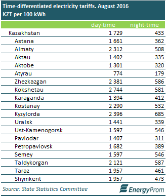 Residents of Kostanay paid the highest electricity charges among major Kazakh cities and town (KZT1,723 per 100 kWh for Category 1 (up by 3.7% year on year), while residents of Aktau paid the least (KZT456 for Category 1 (up by 46.4% year on year).