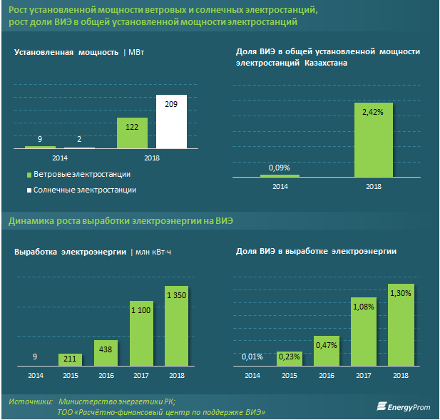 * В рамках действующего законодательства Казахстана к возобновляемым источникам энергии относятся ветровые электростанции (ВЭС), солнечные электростанции (СЭС), малые гидроэлектростанции (ГЭС) мощностью до 35 МВт, а также электростанции на биогазе.
