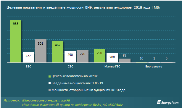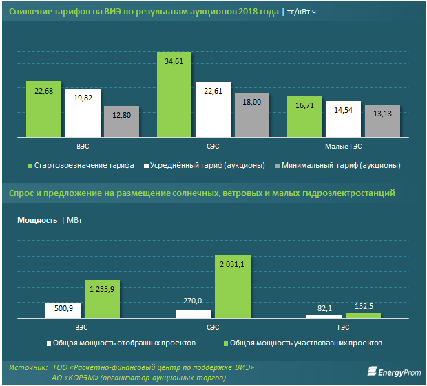 Новый аукционный механизм привёл к снижению стоимости кВт·ч по солнечным электростанциям на 34%, по ветровым и гидроэлектростанциям малой мощности — на 13%. По экспертным оценкам, снижение затрат на покупку электроэнергии от данных проектов ВИЭ для покупателей составит до 10 млрд тенге в год.