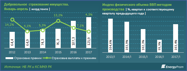 Рост сбора премий по страхованию имущества происходит при одновременном увеличении деловой активности в экономике Казахстана. По итогам 1 квартала 2017 года ВВП РК вырос на 3,4% по сравнению с аналогичным периодом 2016 года. Напомним, что год назад в январе-марте было зафиксировано падение производства товаров и услуг в РК на 0,1%.