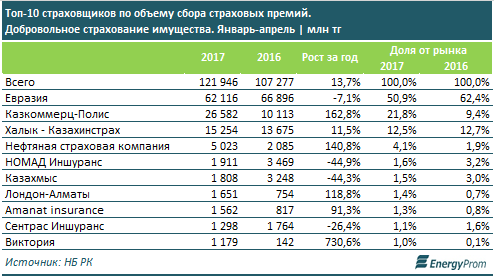 Первое место по объему премий по добровольному страхованию имущества занимает Евразия — 62,1 млрд тенге. По сравнению с январем-апрелем 2016 года уменьшение на 7,1% (4,8 млрд тг), доля на рынке упала с 62,4% до 50,9%.