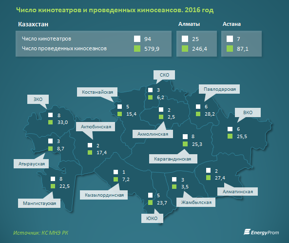 В целом по стране к началу текущего года казахстанцам оказывали услуги 94 кинотеатра (против 93 в 2015 году). В прошлом году в них провели 579,9 тысячи киносеансов — на 11,5% больше, чем годом ранее.