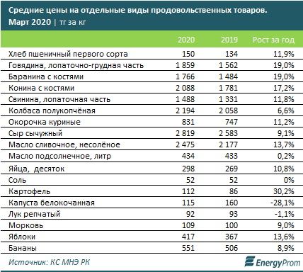 В связи с разразившимся кризисом из-за распространения коронавирусной инфекции инфляция в Казахстане в марте вышла за пределы коридора 4–6%, заложенного НБ РК, и составила 6,4%. В свою очередь, цены на продовольственные товары в марте выросли на 9,3% в годовой динамике. Подорожали хлебобулочные изделия и крупы, мясо, рыба и морепродукты, молочные продукты, яйца, масла и жиры, кондитерские изделия, фрукты и овощи, безалкогольные и алкогольные напитки.