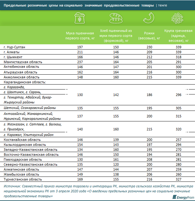 С 4 апреля 2020 года министерства торговли, сельского хозяйства и национальной экономики подписали совместный приказ «О введении предельных розничных цен на социально значимые продовольственные товары» в период действия чрезвычайного положения в РК, передаёт пресс-служба Министерства торговли и интеграции.