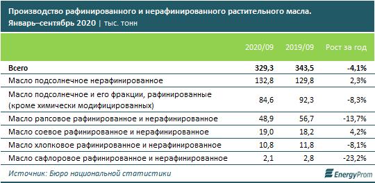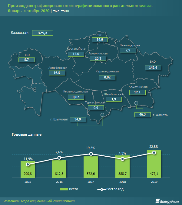 За январь–сентябрь 2020 года в стране произвели 329,3 тыс. тонн рафинированного и нерафинированного растительного масла — на 4,1% меньше, чем в прошлом году. Более двух третей производства приходится всего на три региона страны: Восточно-Казахстанскую область (142,6 тыс. тонн — на 16,1% меньше, чем годом ранее), Алматы (46,3 тыс. тонн, минус 8,8%) и Шымкент (34,9 тыс. тонн, плюс 42,8%).