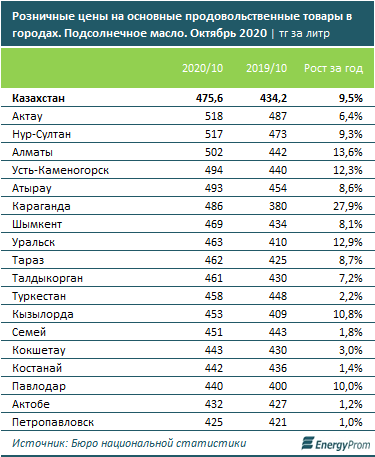 В октябре 2020 года в магазинах и на базарах городов страны стоимость подсолнечного масла составила 475,6 тг за литр — на 9,5% больше, чем годом ранее.