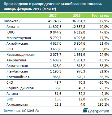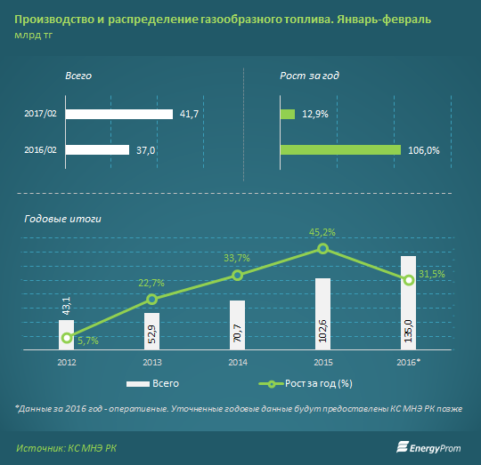 За январь-февраль 2017 производство и распределение газообразного топлива достигли 41,7 млрд тг — на 12,9% больше, чем в аналогичном периоде годом ранее. Многолетняя динамика показывает стабильный рост. Так, в 2016 году показатели увеличились относительно 2015 на 31,5%, 2015 обогнал 2014 сразу на 45,2%