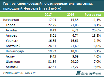 Цена на природный газ, транспортируемый по распределительным сетям, выросла для потребителей за год на 11,1%, до 17,05 тг за куб м по итогам февраля.